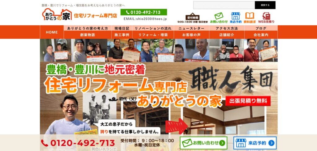 「ありがとうの家」は、豊橋市を拠点に地域密着でリフォーム・リノベーションを手掛けています。「やって良かった」と思っていただける工事をモットーに、お客様一人ひとりの想いに寄り添い、培ってきたノウハウと情熱を注ぎ込みます。